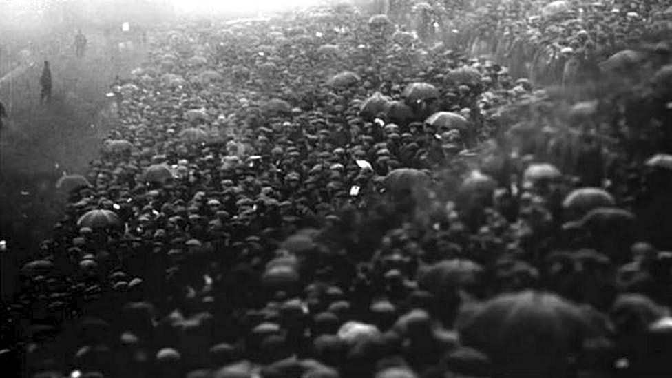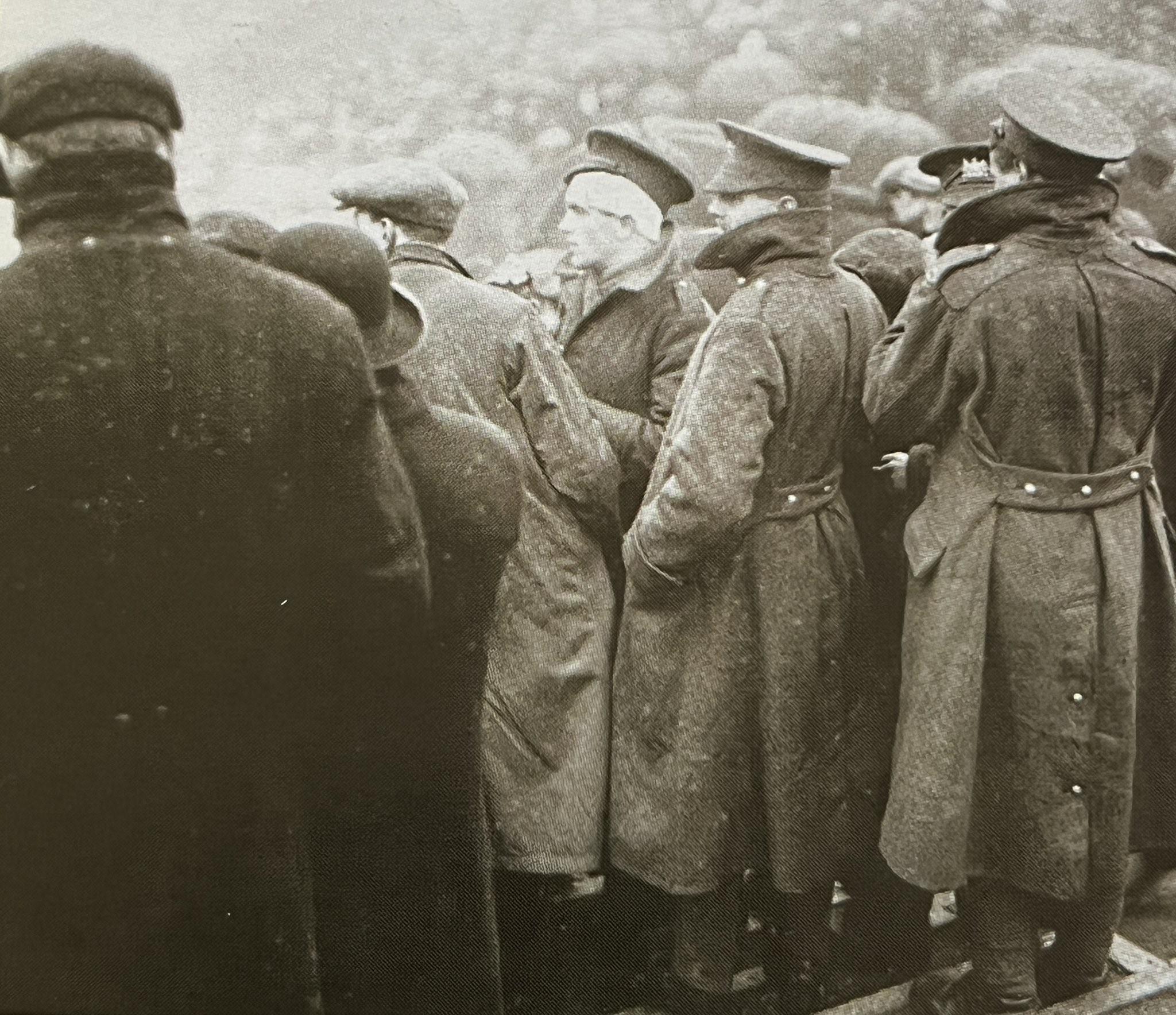 当天有一张照片,视角是从看台上向球场拍摄,相片中站满了身着军装、戴着帽子的军人,他们的身后是白茫茫一片的球场,那是光线过度曝光之后形成的白雾,但从视觉上来看,球场就像是被浓雾遮挡住了,加上英国春季的绵绵细雨,显得格外阴沉。