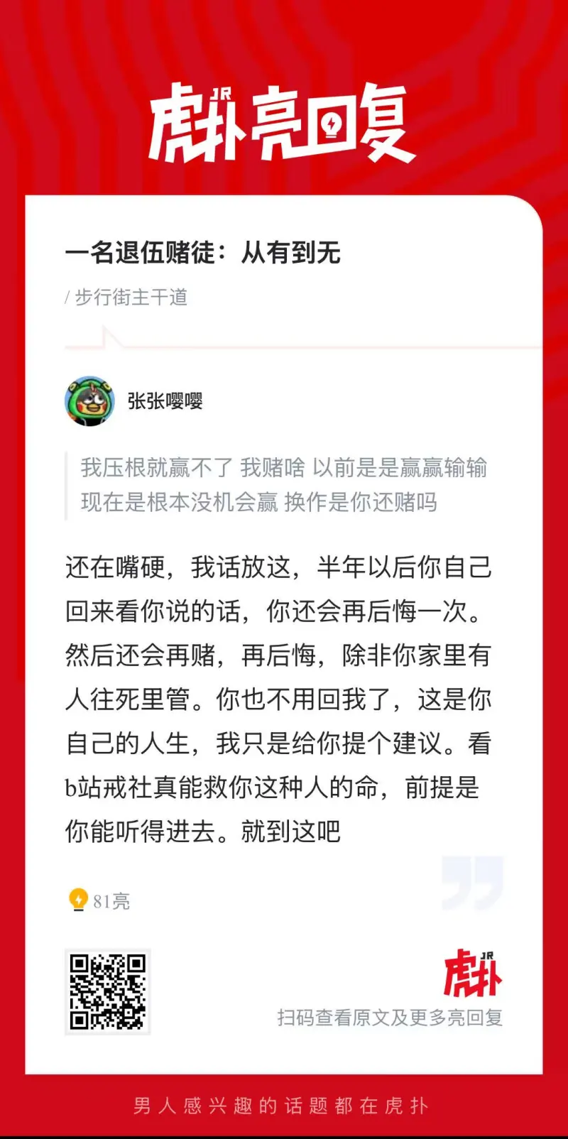 今天的热议来自一位赌徒JR的自述:楼主用亲身经历记录了从2020年到现在,如何因为网赌和创业,将一副“好牌”打得稀烂,最终负债210万的过程。原贴戳>>>一名退伍赌徒:从有到无帖子下也有很多JR现身说法:世界上没有免费的午餐也有JR说着最硬的话,但其实是真心劝诫JRs来说...